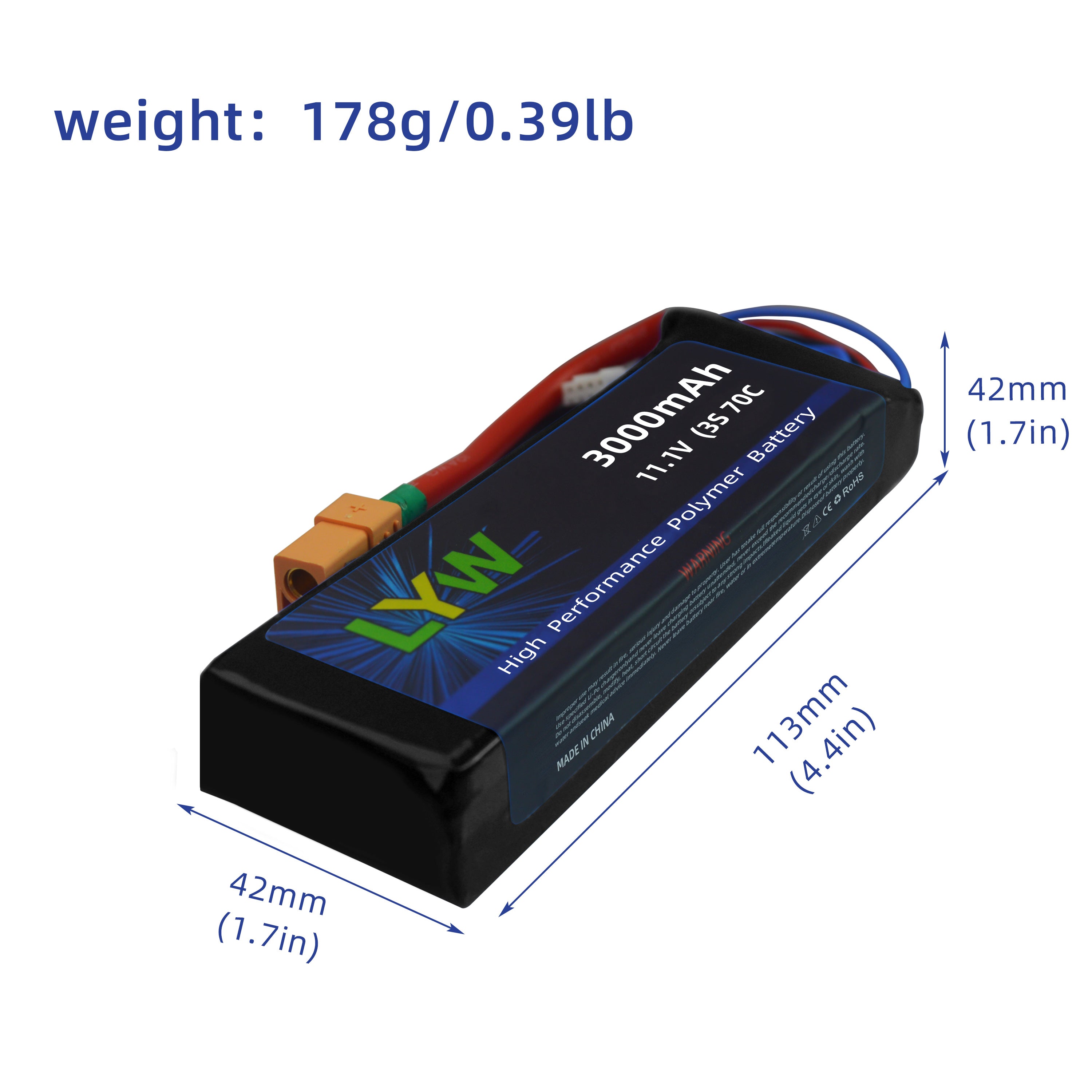 La batería lipo LYW de 3000 mAh y 3 s de 70 c con conector XT90 está especialmente diseñada para aviones, barcos o cualquier vehículo RC. Es compatible principalmente con E-flite Habu SS, Turbo Timber SWS y Ultra Stick.